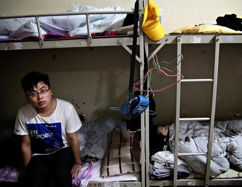 富士康一名員工從睡夢(mèng)中醒來,而他的兩名同事仍在繼續(xù)睡覺。在富士康宿舍中,8名工人共用一個(gè)單間。