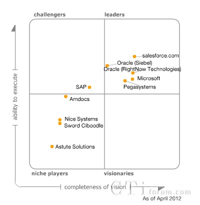 位于魔力象限中領(lǐng)導(dǎo)者(leaders)象限的廠(chǎng)商有salesforce.com公司、Oracle (RightNow Technologies)公司、Oracle (Siebel)公司、Microsoft公司和Pegasystems 公司。位于挑戰(zhàn)者(challengers)象限的廠(chǎng)商是SAP公司。位于觀望著(niche players)象限的廠(chǎng)商是Amdocs公司、Astute Solutions公司、Nice Systems公司和Sword Ciboodle公司。