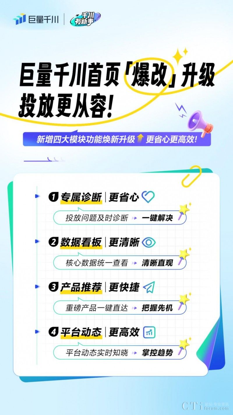 近期,為直面商家投放困境,全面提升投放效率,巨量千川PC端首頁(yè)全新推出四大重磅升級(jí)——上線「專(zhuān)屬診斷建議」、「數(shù)據(jù)看板」、「重磅產(chǎn)品推薦」和「平臺(tái)動(dòng)態(tài)」,助力商家更便捷、更從容地提升投放質(zhì)量和效果,高效推動(dòng)生意增長(zhǎng)!