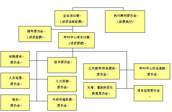。。對(duì)于呼叫中心建設(shè)項(xiàng)目實(shí)施的規(guī)劃是一個(gè)需要付出巨大心血與努力的階段,這個(gè)階段需要企業(yè)或組織機(jī)構(gòu)所有人員的廣泛參與和專家意見。對(duì)于呼叫中心運(yùn)營的規(guī)劃,相對(duì)與呼叫中心建設(shè)項(xiàng)目而言則顯得有些"特殊",它意味著整個(gè)呼叫中心建設(shè)項(xiàng)目團(tuán)隊(duì)不可能有全部的時(shí)間花費(fèi)在運(yùn)營規(guī)劃議題上。因此,我們可以將全部項(xiàng)目規(guī)劃工作與任務(wù)拆分成若干個(gè)規(guī)劃細(xì)項(xiàng),這將保證有較強(qiáng)的可操作性。我們建議采取的方式是將整個(gè)項(xiàng)目實(shí)施規(guī)劃團(tuán)隊(duì)拆分成負(fù)責(zé)各個(gè)專項(xiàng)實(shí)施的小組委員會(huì)或附屬委員會(huì)。這些小組委員會(huì)將集中關(guān)注各自特定的項(xiàng)目實(shí)施上,當(dāng)有需要時(shí),與其他各小組進(jìn)行交流與溝通,并在相關(guān)問題上達(dá)成一致。按照以上項(xiàng)目組織管理架構(gòu)其目的是,在項(xiàng)目實(shí)施的關(guān)鍵環(huán)節(jié)和領(lǐng)域,能產(chǎn)生出更具深度的規(guī)劃方案。這樣操作同時(shí)可以使更多的人員參與進(jìn)來,并有利于增強(qiáng)各個(gè)小組的責(zé)任感,有助于項(xiàng)目的成功實(shí)施。以下的項(xiàng)目指導(dǎo)委員會(huì)組織架構(gòu)不是任何呼叫中心建設(shè)項(xiàng)目都能適用的,但是它在某種程度上已經(jīng)為呼叫中心項(xiàng)目規(guī)劃提出了一個(gè)基本方針,按照這個(gè)思路它將保證項(xiàng)目的成功實(shí)施。而對(duì)于規(guī)模較小的呼叫中心項(xiàng)目,以上的組織架構(gòu)成員將扮演多重角色,并負(fù)責(zé)多項(xiàng)任務(wù)項(xiàng)目的實(shí)施。就呼叫中心項(xiàng)目規(guī)劃與實(shí)施團(tuán)隊(duì)而言,應(yīng)由若干個(gè)負(fù)責(zé)不同領(lǐng)域?qū)嵤┑男〗M來組成,以便確保呼叫中心建設(shè)項(xiàng)目的所有領(lǐng)域,及各個(gè)階段的有效實(shí)施。呼叫中心項(xiàng)目規(guī)劃與實(shí)施組織架構(gòu)請(qǐng)見下圖。