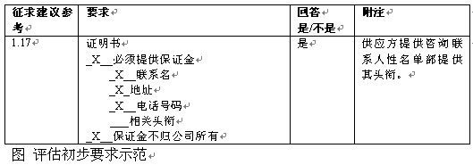 。。在評估的這一部分中通常不給予建議申請的"初步強制性要求"。但是,若不提供基本要求的信息,可能造成停止對某一特定建議評估。圖x中的示范工作表用來檢驗供應(yīng)方對這些初步要求的回應(yīng)。