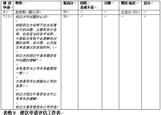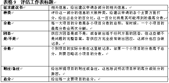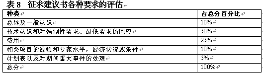 。。在決定了初步要求之后,評估小組應(yīng)具體地開展評估工作。具體評估的目標是通過給建議書主要方面打分作出評估。可以在算出建議書各方面占總分數(shù)的百分比,如表8中對各方面的總覽。一般在建議書內(nèi)向提供者給出這一信息。