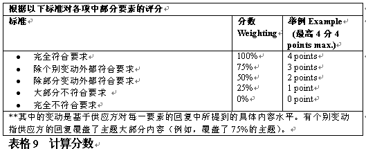 。。評分者應(yīng)該了解供應(yīng)方對所提建議申請的回復(fù),從各方面評估該建議符合每一評判標準的情況,相應(yīng)地給出分數(shù)。根據(jù)每個標準,應(yīng)在評判過程中分組給出最高分數(shù)。表格9舉例說明了如何對回復(fù)打分。.