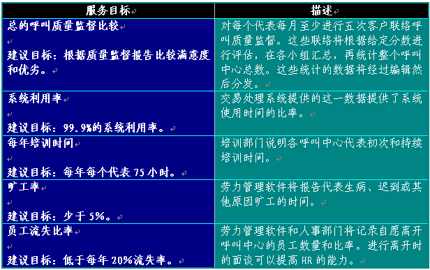 應對從服務代表到支持員工的中心所有職務進行評估。例如,信息技術小組對呼叫長度和善后時間有直接影響,因為它運用和調配中心的人員和技術提供服務。根據中心呼叫接聽的服務水平目標,將對呼叫中心小組全體成員進行評估。服務水平目標將每天、每周、每月傳達。