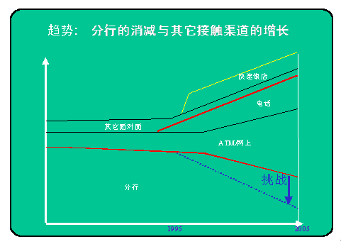 。。下圖為國外專家對銀行不同客戶服務渠道發(fā)展比例的說明?梢钥吹,營業(yè)廳的比例在逐年下降,而國外不少銀行甚至將進一步壓縮營業(yè)廳比例作為一項渠道的任務。電話銀行也就是通過IVR實現的自助服務,自然是呼叫中心的一部分,但人工服務,包括對上網及其它互動方式的客戶提供的座席代表服務,當然更是現代呼叫中心業(yè)務的一部分,圖上雙紅線內所表示的正是不斷發(fā)展的呼叫中心的所占比例。