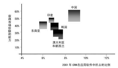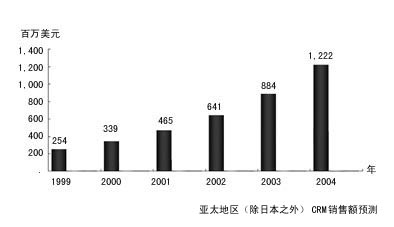 亞太地區(qū)正在成為CRM應(yīng)用軟件的新興市場。1999年亞太地區(qū)CRM市場的年增長率達(dá)33.5%。其中中國CRM市場是除日本外最具發(fā)展?jié)摿Φ氖袌。預(yù)計到2004年,中國CRM市場的復(fù)合年平均增長率為60%。