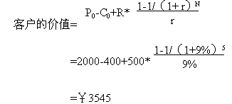 下面舉另一個(gè)例子具體說(shuō)明客戶價(jià)值的計(jì)算: 假設(shè)客戶與公司保持交易時(shí)間:N=5年;公司最初吸引每個(gè)客戶的成本(營(yíng)銷費(fèi)用): C0=¥400;客戶第一次購(gòu)買的產(chǎn)品價(jià)格:P0=¥2000;公司期望每年從每個(gè)客戶處增加的收入:R=¥500;利率(一般指貸款利率): r =9%;那么客戶的價(jià)值等于:客戶初次購(gòu)買產(chǎn)品和以后幾年每年消費(fèi)價(jià)值的折現(xiàn)之和,減營(yíng)銷成本,即: