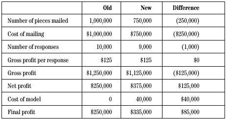 請注意,郵寄的純利潤增加了$125,000,甚至你扣除由于數(shù)據(jù)采集而產(chǎn)生的軟件、硬件即人力資源方面的$40,000,純利潤還增加了$85,000。建模的投入轉(zhuǎn)化成了200%的收益,這遠(yuǎn)遠(yuǎn)超過了BB&CC對這一項目的ROI要求。