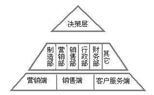 20世紀古典組織結構理論長期在企業(yè)組織設計中占主導地位。體現了統(tǒng)一指揮、效率優(yōu)先、幅度合理、權責一致和分工協(xié)作的傳統(tǒng)企業(yè)的最優(yōu)組織結構常被稱作“金字塔”結構,其特點是決策權集中、管理層次較多,職能部門獨立,有較明顯和嚴格的等級。下圖是一個典型的“金字塔”結構的企業(yè)模型: