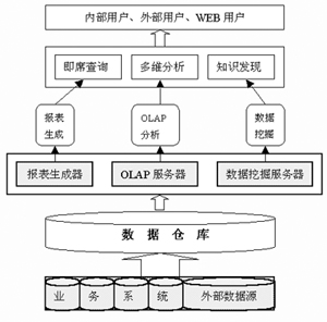三個層次簡單明了,但在實際實施時,卻需要應(yīng)用數(shù)據(jù)挖掘、人工智能、機器學習等多個領(lǐng)域的理論和技術(shù),以及統(tǒng)計學、決策科學、計算機科學等方面專業(yè)人才的密切合作,才能從數(shù)據(jù)倉庫的海量數(shù)據(jù)中淘出所需要的“金”;跀(shù)據(jù)倉庫的CRM體系結(jié)構(gòu)如圖所示。