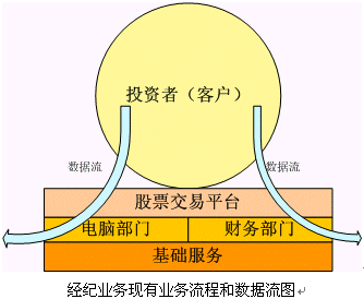 。。從上圖可以看出,現(xiàn)在的證券公司的經(jīng)紀(jì)業(yè)務(wù)為各個(gè)股民或者說(shuō)投資者所提供的服務(wù)就是交易平臺(tái)的服務(wù),也就是交易通道服務(wù)。營(yíng)業(yè)部的其他服務(wù)都是為這個(gè)交易通道服務(wù),這些服務(wù)品種都是非常基礎(chǔ)的。而營(yíng)業(yè)部的數(shù)據(jù)流,也就是各個(gè)客戶的基本信息和交易信息,通過(guò)電腦部和財(cái)務(wù)部門就走到了終結(jié),沒(méi)有被更好的利用。