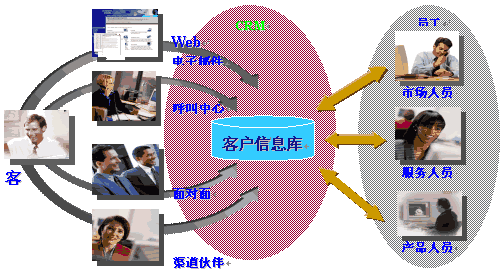 CRM是在90年代,隨著Internet的發(fā)展成熟起來。它充分利用了Internet技術,通過電話中心、網(wǎng)站、電子郵件、移動技術的使用,提供客戶多種形式的渠道,完成銷售、服務、市場等多種職能和流程,滿足客戶不同種類、不同層次的需求。這些渠道全方位地收集客戶信息,并通過集中的數(shù)據(jù)庫進行管理和共享。而數(shù)據(jù)挖掘技術幫助企業(yè)進一步分析客戶需求,提供決策支持。如下圖(資料來源:Siebel公司)。