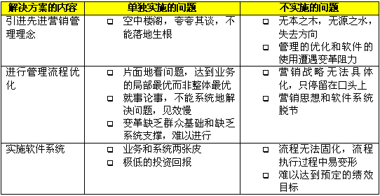 在CRM出現(xiàn)以前,企業(yè)為了解決市場、銷售和服務方面的問題,更好地吸引、獲得、保留和發(fā)展客戶,采取了各種方式,比如使用一套分銷管理的解決方案,或者請"點子公司"出謀劃策,或者尋求某個具體業(yè)務的優(yōu)化。以上這些做法往往只能完成局部的改進,或取得短期的效果,無法形成長期和整體的競爭優(yōu)勢。原因就在于這些解決方案都只提供了片面的、局部的解決方案,"頭痛醫(yī)頭,腳痛醫(yī)腳"不能綜合管理理念、業(yè)務流程和技術應用這三個方面,系統(tǒng)地分析和解決問題。下表中分析了這些解決方案單獨實施或者不實施會帶來什么問題。