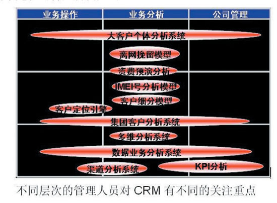 CRM系統(tǒng)自身的特點決定其不產(chǎn)生原始數(shù)據(jù),只是對其他相關(guān)系統(tǒng)所傳遞過來的數(shù)據(jù)進行數(shù)據(jù)抽取到展現(xiàn),所以CRM系統(tǒng)允許一定的數(shù)據(jù)誤差和延遲。但是在實際的建設(shè)和應(yīng)用過程中,廠家和運營商都發(fā)現(xiàn)數(shù)據(jù)的準(zhǔn)確性和及時性是CRM系統(tǒng)應(yīng)用的最大瓶徑。同時早期參照國際標(biāo)準(zhǔn)建立的CRM系統(tǒng)根本不符合國內(nèi)應(yīng)用的要求,于是才逐漸發(fā)展出現(xiàn)了A-CRM(操作型CRM)和O-CRM(運營型CRM)之分,用以滿足不同層次人員對CRM系統(tǒng)的應(yīng)用要求。