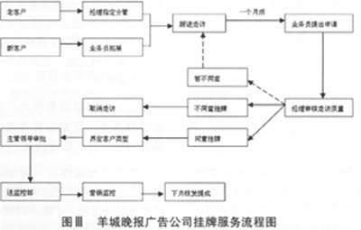 監(jiān)控部門負(fù)責(zé)對(duì)市場(chǎng)和公司業(yè)務(wù)的監(jiān)控。市場(chǎng)監(jiān)控的核心是同城媒體的廣告業(yè)務(wù)監(jiān)測(cè),監(jiān)控部門搜集同城媒體廣告版面投放的明細(xì)數(shù)據(jù),并以此做出詳細(xì)分析,為管理層提供監(jiān)測(cè)報(bào)表;同時(shí)評(píng)價(jià)客戶在廣告市場(chǎng)上的最新表現(xiàn),掌握新進(jìn)客戶、忠實(shí)客戶、拓展客戶等形態(tài)的變化。廣告公司對(duì)客戶的跟進(jìn)是通過(guò)一線業(yè)務(wù)員的掛牌服務(wù)實(shí)現(xiàn)的(見(jiàn)圖Ⅲ),營(yíng)銷監(jiān)控就是對(duì)業(yè)務(wù)人員的工作進(jìn)行實(shí)時(shí)掌控,以此劃分客戶服務(wù)資源,協(xié)調(diào)業(yè)務(wù)營(yíng)銷秩序。監(jiān)控部門有一整套掛牌、監(jiān)控的規(guī)定,可對(duì)掛牌的業(yè)務(wù)人員實(shí)施業(yè)務(wù)營(yíng)銷監(jiān)控,作為進(jìn)行業(yè)務(wù)提成核算的重要依據(jù)。在監(jiān)控流程中,掛牌的《申請(qǐng)報(bào)表》、《客戶資料更改報(bào)表》、《業(yè)務(wù)計(jì)劃報(bào)表》、《業(yè)務(wù)營(yíng)銷報(bào)表》等一系列報(bào)表不但保證了客戶服務(wù)的質(zhì)量,也為客戶數(shù)據(jù)庫(kù)提供信息來(lái)源。監(jiān)控部門還以電話訪問(wèn)方式保證資料的實(shí)時(shí)性和真實(shí)性,同時(shí)進(jìn)行客戶滿意度調(diào)查。當(dāng)這些資料由業(yè)務(wù)人員匯集到數(shù)據(jù)庫(kù),維護(hù)客戶則從業(yè)務(wù)員的個(gè)人行為上升至公司行為,大大提高了公司掌控客戶服務(wù)的效率,確保了客戶服務(wù)的效果。