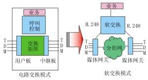 在電路交換網(wǎng)中,呼叫控制、業(yè)務(wù)提供以及交換矩陣均集中在一個(gè)交換系統(tǒng)中,而軟交換的主要設(shè)計(jì)思想是業(yè)務(wù)/控制與傳送/接入分離,各實(shí)體之間通過標(biāo)準(zhǔn)的協(xié)議進(jìn)行連接和通信,以便在網(wǎng)上更加靈活地提供業(yè)務(wù),見圖1。更具體地講,軟交換是一個(gè)基于軟件的分布式交換/控制平臺(tái),它將呼叫控制功能從網(wǎng)關(guān)中分離出來,開放業(yè)務(wù)、控制、接入和交換間的協(xié)議,從而真正實(shí)現(xiàn)多廠家的網(wǎng)絡(luò)運(yùn)營環(huán)境,并可以方便地在網(wǎng)上引入多種業(yè)務(wù)。