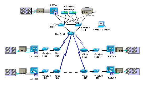 各地:采用CISCO2620路由器和AS5300語音網(wǎng)關(guān)。Cisco2620配2個(gè)串口和1個(gè)100M以太網(wǎng)口,串口用來連接DDN網(wǎng)絡(luò),100M口連到石油專用通信網(wǎng)局內(nèi)部數(shù)據(jù)網(wǎng)絡(luò),并與CISCO AS5300相連。AS5300有1個(gè)100M以太網(wǎng)口,1個(gè)10以太網(wǎng)口,4個(gè)E1口,60個(gè)VOIPDSP。4個(gè)E1口連接交換機(jī)。