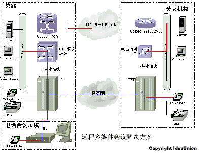 圖中紅色實(shí)線表示通過IP網(wǎng)絡(luò)傳輸語(yǔ)音的線路,藍(lán)色虛線表示通過PSTN傳輸語(yǔ)音的線路。由于通過IP網(wǎng)絡(luò)沒有使用額外的長(zhǎng)途線路,所以降低了遠(yuǎn)程會(huì)議系統(tǒng)的運(yùn)行成本。同時(shí)VoIP傳輸系統(tǒng)支持普通的長(zhǎng)途電話呼叫,為客戶節(jié)省長(zhǎng)途電話開支。
