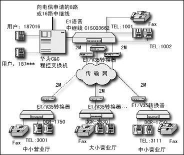 市聯(lián)通通過在Cisco 3662路由器上配置一個NM-HDV-1E1-30E語音中繼模塊,通過75歐姆同軸電纜與華為程控交換機(jī)的E1接口板相連,提供30路話音,該路由器用作語音網(wǎng)關(guān)。各網(wǎng)點(diǎn)配置神州數(shù)碼路由器,配置MR-VIC-2FXS或MR-NM-4FXS語音模塊,提供多路語音。