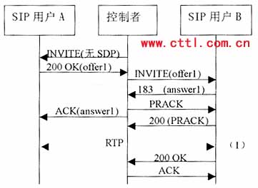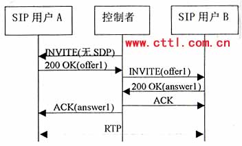 控制者再向B發(fā)送一個沒有SDP的INVITE。B應答的200 0K響應中包含一個提供offer2,控制者應該基于offer2向A發(fā)送一個re-INVITE,注意。offer2可能需要稍作修改來滿足媒體要求。例如如果offer1包含一個音頻和一個視頻行,而offer2只有一個音頻行,控制者就需要在offer2中增加一個視頻行(端口設為O)來構(gòu)成offer2’。由于這是一個re-INVITE,所以通常應該能立即收到響應。A的200