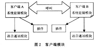 如圖2所示,客戶端由2個(gè)主要模塊組成:系統(tǒng)駐留模塊、語音通訊模塊。