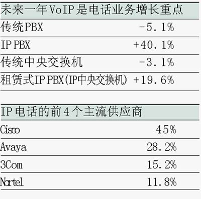 事實上,北美市場的實際銷售量已經表明,市場中的傳統(tǒng)語音交換機銷售量已經在明顯下降,而具備IP功能或純IP系統(tǒng)的銷售量卻在穩(wěn)步上升。Gartner 預計,2005年在北美地區(qū)銷售的純IP系統(tǒng)總價值將高達9.03億美元,比2004年的6.86億美元上升32%。同時,傳統(tǒng)電路交換系統(tǒng)的銷售量將從2004年的14億美元下降至9.99億美元,下降的幅度是32%。而混合式系統(tǒng)的銷量增長幅度可望達到30%,也就是說,從2004年的1.5億美元增長到2005年的2億美元。
