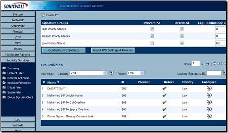 SonicWALL入侵檢測服務(wù)(IPS)能夠為VoIP協(xié)議應(yīng)用層提供全面保護。IPS集成了一個可配置的超高性能掃描引擎,配合動態(tài)更新和擁有1900多攻擊和漏洞簽名的數(shù)據(jù)庫,可以保護網(wǎng)絡(luò)免受最復雜的木馬和變形威脅的影響。SonicWALL已經(jīng)利用一系列VoIP相關(guān)的簽名來擴展其IPS簽名數(shù)據(jù)包,可以防止惡意業(yè)務(wù)流到達受保護的VoIP電話和服務(wù)器。