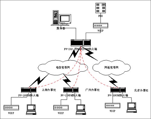 VPN防火墻網(wǎng)關(guān)具有雙WAN口和QOS帶寬管理功能,總部同時(shí)接入兩條ADSL線路,通過策略路由,把內(nèi)部網(wǎng)絡(luò)的上網(wǎng)訪問全部從WAN2的ADSL上網(wǎng),而把VOIP和VPN全部通過WAN1的ADSL來傳輸,從而避免了上網(wǎng)的請(qǐng)求占用VPN和VOIP的帶寬。同時(shí),通過對(duì)內(nèi)部網(wǎng)絡(luò)不同的業(yè)務(wù)劃分不同的優(yōu)先級(jí),特別是把VOIP的優(yōu)先級(jí)做為最高,優(yōu)先轉(zhuǎn)發(fā)VOIP的數(shù)據(jù)包,同時(shí)又通過VOIP和VPN傳輸分配最大和最小的保證帶寬,來保護(hù)VOIP業(yè)務(wù)的正常通信。除此之外,F(xiàn)V-202強(qiáng)大的訪問控制功能,特別是對(duì)VPN隧道的訪問控制功能,可以對(duì)各地的分公司通過VPN訪問總公司的服務(wù)器進(jìn)行控制,為不同的客戶分配不同的權(quán)限,讓遠(yuǎn)程的VPN隧道只能訪問指定的IP地址或相關(guān)的業(yè)務(wù)端口,能很好保證VPN的訪問安全。特別值得一提的是,F(xiàn)V-202支持網(wǎng)通、電信雙線路接入,如果由于北方網(wǎng)通跨網(wǎng)接入,可以在全部申請(qǐng)網(wǎng)通線路,把北方的分支機(jī)構(gòu)接入到總部的網(wǎng)通線路,可以避免由于跨網(wǎng)帶來的帶寬瓶頸。在各個(gè)分支機(jī)構(gòu)配置iRouter的FV-20VPN防火墻,為各個(gè)分支機(jī)構(gòu)構(gòu)建一道安全的防線,實(shí)現(xiàn)與總部的VPN的聯(lián)接。同時(shí),外出的員工或領(lǐng)導(dǎo)通過IPSEC的撥號(hào)軟件,實(shí)現(xiàn)移動(dòng)的接入,通過VPN,東莞奧愛斯構(gòu)建全國的融合的安全通信平臺(tái),既可以解決VOIP的被竊聽的風(fēng)險(xiǎn),又能實(shí)現(xiàn)實(shí)時(shí)的數(shù)據(jù)訪問。從而大大地降低公司長(zhǎng)途的話費(fèi)和以往租用數(shù)據(jù)專線的高昂的費(fèi)用,提高了公司的工作效率,為公司帶來十分明顯的經(jīng)濟(jì)效益。