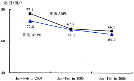 圖4 2004-2006年固定電話(huà)與移動(dòng)電話(huà)的ARPU對(duì)比
