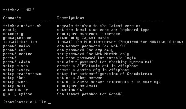 理論上,在安裝完成之后,用戶即可通過(guò)Web界面進(jìn)行配置,但是我們強(qiáng)烈建議用戶首先登錄進(jìn)入命令行界面,修改各組件相關(guān)的各個(gè)口令。使用help-trixbox功能,即可訪問(wèn)Trixbox主要組件的管理、升級(jí)、維護(hù)和配置腳本,如圖1所示。其中,以“passwd”為開(kāi)始的命令用于修改各主要管理界面的口令。此外,對(duì)于安裝了FXS/FXO語(yǔ)音卡的用戶,需要首先運(yùn)行g(shù)enzaptelconf腳本,生成基本的zaptel配置文本。需要提醒的是,用戶應(yīng)該慎用yum-update命令,因?yàn)樵撁钪粚?duì)CentOS進(jìn)行常規(guī)更新,有可能會(huì)改變Asterisk相關(guān)的配置文件,使Asterisk在系統(tǒng)重新啟動(dòng)之后無(wú)法正常運(yùn)行。