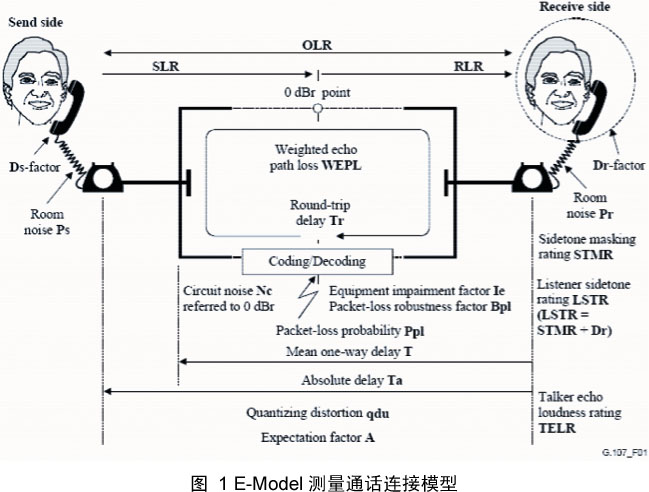 E-Model是基于如下通話連接模型進行測量的(見圖1),其最終的測量結果就是得到R值(R Factor),被稱為全面的網(wǎng)絡傳輸?shù)燃壱,也就是說,確定包含話音通道的“由口至耳”特性的“R”因素。R因素的取值范圍為0~120,窄帶電話上R因素通常取50~94,而寬帶電話上R取值在50~110。R因素的值可以轉換為會話和收聽質量MOS得分(MOSCQ
