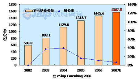 從圖中可以看出,國內(nèi)IP電話市場近年呈現(xiàn)出快速增長趨勢,2002-2007年年均增長率為20.7%。預計2007年IP電話的通話時長將達到1567.6億分鐘,同比增長7%。但從2005年開始,IP電話的增長率呈下降趨勢,這主要是受管制限制和移動長途的替代作用所致。