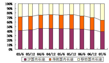 從圖中可以看出,IP電話的相對快速增長在一定程度上對傳統(tǒng)長途電話形成了替代作用,但近年來自于移動長途的替代作用更明顯。從占比上來看,2007年上半年,IP國內(nèi)長途電話占全部國內(nèi)長途通話量38.3%,超過移動長途電話的35.9%和傳統(tǒng)長途電話的25.8%,仍然是長途電話的主流。