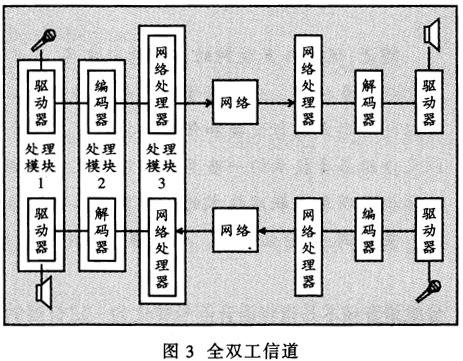 ——傳輸是依靠每一端三級的同步有效操作。如圖3所示,在像IP電話這樣的全雙工通信中,每一端的六級都是連續(xù)工作的。因此在具體應(yīng)用時為了減少分離處理的數(shù)量,這六級被合成同時工作的三個處理過程。