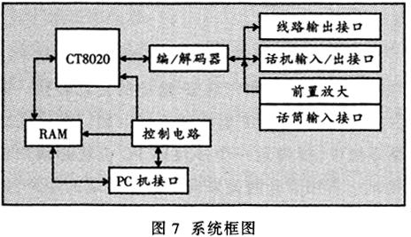 ——硬件平臺構(gòu)造于PC機上,采用ISA總線插卡方式,如圖7所示。該平臺采用了美國DSPG公司的專用數(shù)字信號處理器CT8020作為核心部件,利用先進的可編程邏輯器件開發(fā)了外圍控制電路和接口電路。它主要完成以下功能。
