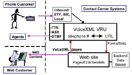 從圖中我們可以看出,同傳統(tǒng)的INTERNET網(wǎng)站相比,在不需要太大的改動(dòng)前提下,只要增加一個(gè)VoiceXml的服務(wù)器處理來(lái)自PSTN的應(yīng)用即可。在VoiceXml的服務(wù)器中,包含了VoiceXml的解釋器(VoiceXml解釋程序語(yǔ)境),VoiceXml自帶的瀏覽器,自動(dòng)語(yǔ)音識(shí)別(ASR)及文本到語(yǔ)音(TTS)的轉(zhuǎn)換設(shè)備。
