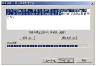 一般情況下,我們最好在語音識別功能安裝結束后立即按照系統(tǒng)提示單擊"下一步"對語音識別功能進行訓練,整個訓練過程包括調整麥克風和訓練Office進行語音識別兩部分(如圖3所示)。