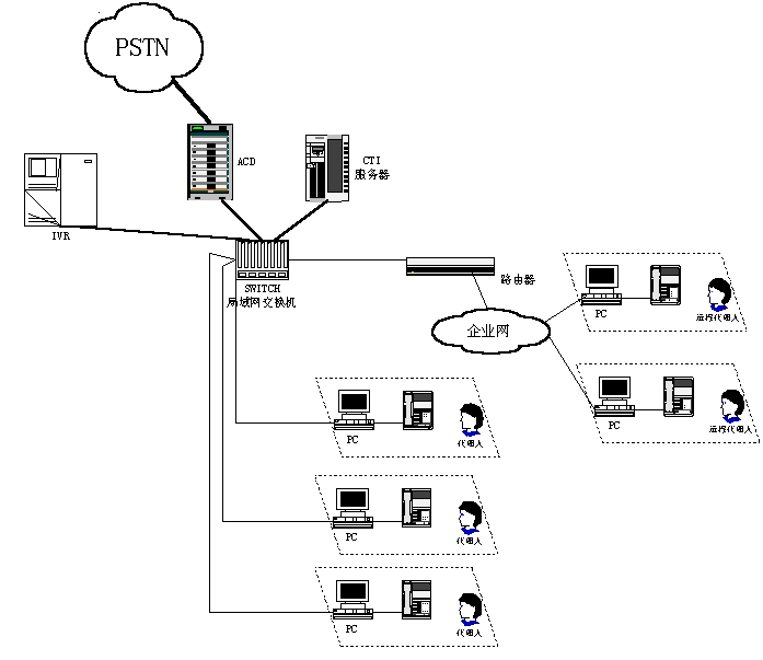 與第二代呼叫中心相比,第三代呼叫中心采用CTI技術實現(xiàn)了語音和數(shù)據(jù)同步。它主要采用軟件來代替專用的硬件平臺及個性化的軟件,由于采用了標準化的通用的軟件平臺和通用的硬件平臺,使得呼叫中心成為一個純粹的數(shù)據(jù)網(wǎng)絡。如圖(4)所示。第三代呼叫中心的優(yōu)點:采用通用軟硬件平臺,造價較低;隨著軟件價格的不斷下調,可以不斷增加新功能,特別是中間件的采用,使系統(tǒng)更加靈活,系統(tǒng)擴容升級方便;無論是企業(yè)內(nèi)部的業(yè)務系統(tǒng)還是企業(yè)外部的客戶管理系統(tǒng),不同系統(tǒng)間的互通性都得到了加強;同時還支持虛擬呼叫中心功能(遠程代理)。