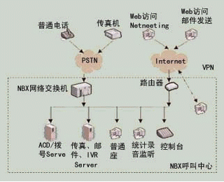 NBX呼叫中心是基于3Com公司NBX網(wǎng)絡(luò)電話(huà)交換機(jī)平臺(tái)構(gòu)筑的、語(yǔ)音數(shù)據(jù)合一的呼叫中心。系統(tǒng)配置拓?fù)浣Y(jié)構(gòu)如圖3所示。