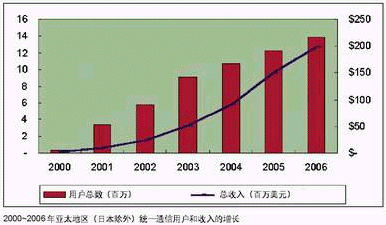 據(jù)IDC預測,亞太地區(qū)(不包括日本)統(tǒng)一通信用戶數(shù)量將從2000年的32萬增長到2006年的1385萬。盡管起點較低,收入將從2000年的119萬美元增長到2006年的1.987億美元。這個增長大部分受中國和澳大利亞推動,在這兩個國家,價格和市場由上層大電信公司決定。