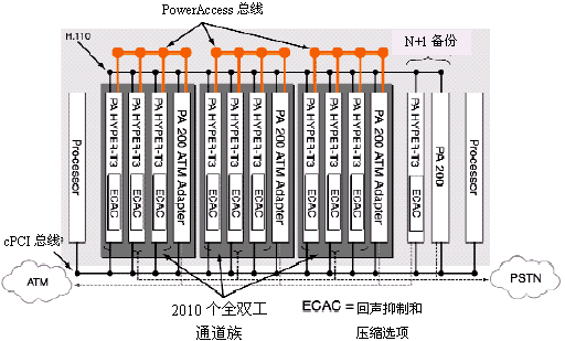 為了解決CompactPCI的這一限制,NMS開發(fā)出了PowerAccess體系結(jié)構(gòu),它借助現(xiàn)有的CompactPCI標準,同時把它的通道容量擴展到2048之上。這種體系結(jié)構(gòu)以PowerAccess總線為特色,PowerAccess總線是一個輔助的4096個TDM時隙,支持現(xiàn)存的CompactPCI H.110總線。由于提供語音通道的增多,從而可以提高系統(tǒng)的密度。