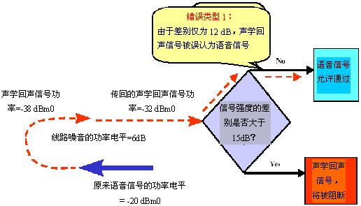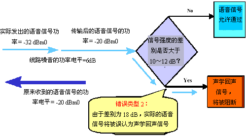 然而,如果判斷過程是根據功率電平的相對差異來進行的(而不是絕對差異),測量結果將更為準確。通過在靜音期間測量兩個傳輸方向上的線路功率電平,就能得知相對的功率電平差異。使用在靜音期間獲得的信息,在分類信號前(即決定信號是聲學回聲還是有效語音),對呼叫兩端的功率電平差異進行修正,就能更加準確地了解相對信號強度。該方法稱為智能語音檢測,它能顯著降?quot;錯誤類型1"出現(xiàn)的可能性,如圖9所示。注意,在分析該方法時,請比對圖5和圖9。