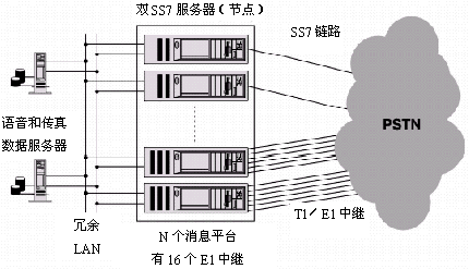 圖6所示為一個運營級的聲訊平臺,這是個面向公眾的開放結構增強業(yè)務平臺。系統(tǒng)由多臺計算機(或叫節(jié)點)組成,節(jié)點間通過以太網(wǎng)相連接以提供冗余功能,這是一個很規(guī)范、具有很高可靠性的系統(tǒng)。在這一例子中,兩個SS7節(jié)點用于為應用提供信令,而其它幾個媒體節(jié)點用于提供和PSTN間的通道連接和呼叫處理功能,包括所有和用戶的音頻或聲音對話,以及信息播放。每個媒體節(jié)點一般使用有一定數(shù)量的線路和DSP資源的板卡,比如NMS