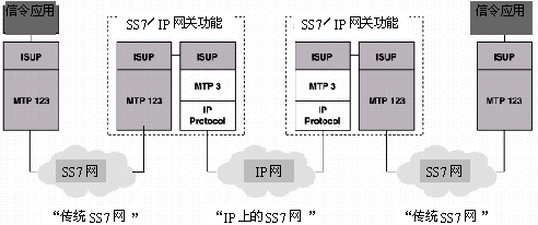 就是兩個PSTN網(wǎng)絡之間通過IP網(wǎng)絡連接起來,PSTN網(wǎng)絡間的SS7信令信息通過IP網(wǎng)透明地傳送到對方。這樣做的目的是:不管呼叫是通過基于電路的PSTN還是通過VoIP網(wǎng)絡,都能向用戶提供相同的隨時隨地的接入和業(yè)務功能集。另外,通過IP網(wǎng)傳遞SS7所需要的基礎傳輸設備成本明顯要比傳送傳統(tǒng)SS7所需要的基礎傳輸設備低得多。(參考圖9)
