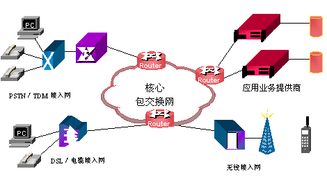 未來的網(wǎng)絡(luò)將會以基于數(shù)據(jù)包的網(wǎng)絡(luò)為核心,交換系統(tǒng)以IP交換和ATM交換等構(gòu)成,能實現(xiàn)包括語音、數(shù)據(jù)和視頻的所有交換需求。各種接入網(wǎng),如:無線網(wǎng)、有線電纜網(wǎng)、DSL、TDM(時分多路復(fù)用)交換網(wǎng)等,通過路由器接入到核心網(wǎng)絡(luò)。
