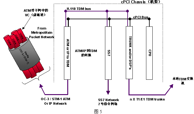 為具體起見,圖6給出一個960話音端口的應用方案,其中用到了三種NMS公司的設備:AG-4000c、S007和TX-3220c,圖中未列出用來運行應用程序的CPU板(AG4000系列板卡不含CPU,而AG600eC包含了CPU)。