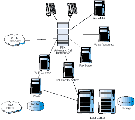 圖1描述了當前一個典型的復雜的企業(yè)通信系統配置。連接到PSTN的主要部分PBX/KTS,仍然是系統的核心,提供了交換和自動呼叫分配的功能。一系列增加的應用通過附屬服務器連接到PBX/KTS上。很多附屬服務器也連到數據中心上,因為它們需要訪問企業(yè)的數據。 使現有情況變得更為復雜的是,Internet正在變?yōu)椴豢扇鄙俚纳虅展ぞ,各公司紛紛安裝VoIP以降低網絡成本,滿足多媒體通信的需要。這些服務由企業(yè)防火墻后的網關提供,這個網關也是連接到PBX/KTS上的。