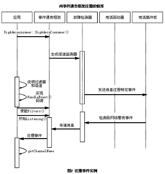 。。在這個事務(wù)中的主要部件是應(yīng)用程序、板卡的設(shè)備驅(qū)動器和管理軟件(包括故障檢測器和事件服務(wù),事件服務(wù)中同時包括事件通告框架)。當電話板卡發(fā)生DSP故障時,板卡上運行的固件通過發(fā)送一條消息通知控制程序?刂瞥绦蚴且粋在初始化時注冊了不同告警和故障的故障檢測器。當它收到這個故障通告后,控制器在事件服務(wù)的事件通告框架的隊列中增加一個事件。最后,使用回調(diào)函數(shù)通知應(yīng)用程序。此時,應(yīng)用程序可以處理這個事件,執(zhí)行必要的操作或者動作。