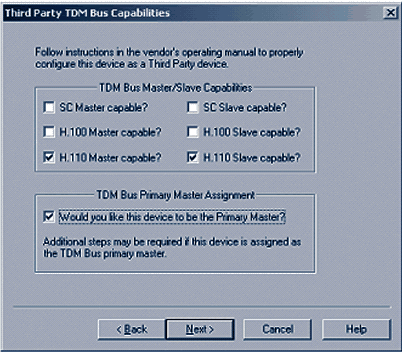 現(xiàn)在需要選擇合適的TDM總線的功能,對合適的類型(對于PCI,選擇H.100,對于CompactPCI,選擇H.110),您需要選擇主選項和客戶端選項。如果該設(shè)備將要為CT總線(客戶端服務(wù)器)提供主時鐘,選中TDM總線主控制選項,然后單擊下一步。圖5顯示的是CompactPCI服務(wù)器在系統(tǒng)中配置為客戶端服務(wù)器的選擇。