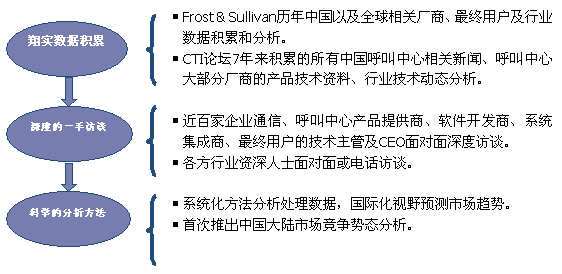 Frost & Sullivan 和 CTI論壇(m.hqgtywhly.com)共同組成的調(diào)研小組,在查閱了大量資料的基礎(chǔ)之上,以企業(yè)通信及呼叫中心的設(shè)備應(yīng)用、投資計(jì)劃以及相關(guān)廠商的市場(chǎng)表現(xiàn)為出發(fā)點(diǎn),通過(guò)對(duì)企業(yè)通信及呼叫中心重要應(yīng)用企業(yè)、在市場(chǎng)占主導(dǎo)地位的二十多家設(shè)備廠商、二十多家軟件開(kāi)發(fā)商、十幾家系統(tǒng)集成商、數(shù)家外包運(yùn)營(yíng)商的深度訪談,參閱內(nèi)部相關(guān)報(bào)告及數(shù)據(jù)庫(kù),對(duì)數(shù)據(jù)的來(lái)源和數(shù)據(jù)的準(zhǔn)確性進(jìn)行了詳細(xì)核對(duì)與論證;憑借參與調(diào)研人員的多年從業(yè)經(jīng)